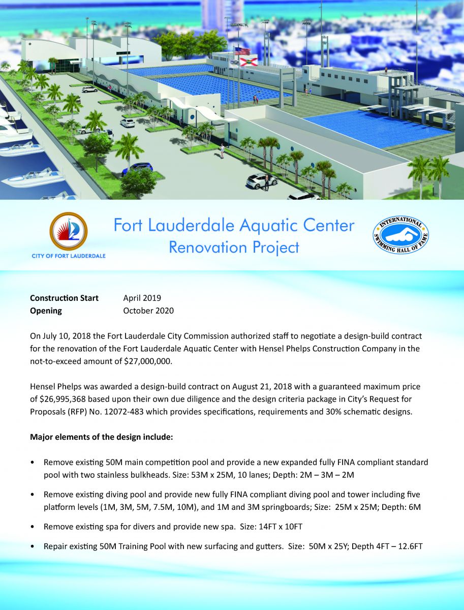 On July 10, 2018 the Fort Lauderdale City Commission authorized staff to negotiate a design-build contract for the renovation of the Fort Lauderdale Aquatic Center with Hensel Phelps Construction Company in the not-to-exceed amount of $27,000,000.